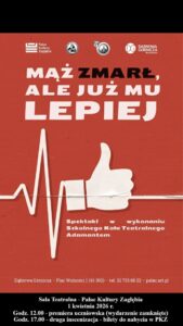 Szkole Koło Teatralne Adamantem z I Liceum Ogólnokształcącego im. Waleriana Łukasińskiego w Dąbrowie Górniczej oraz Pałac Kultury Zagłębia serdecznie zapraszają na spektakl „Mąż zmarł, ale już…